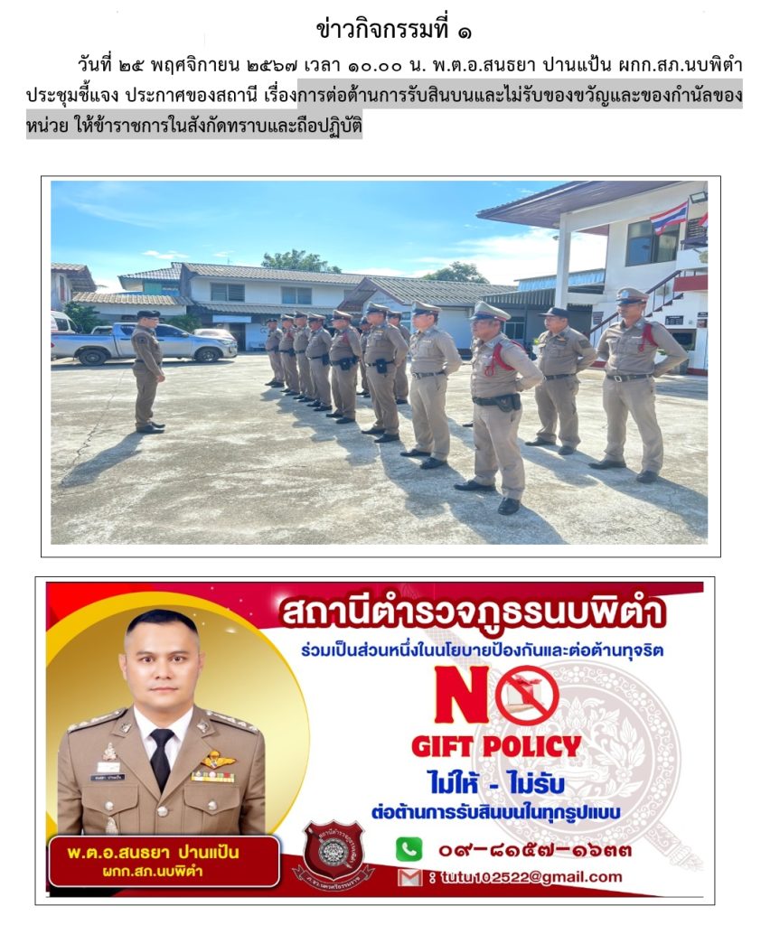กิจกรรมที่ 1. การต่อต้านการรับสินบนและไม่รับของขวัญและของกำนัลของหน่วย ให้ข้าราชการในสังกัดทราบและถือปฏิบัติ