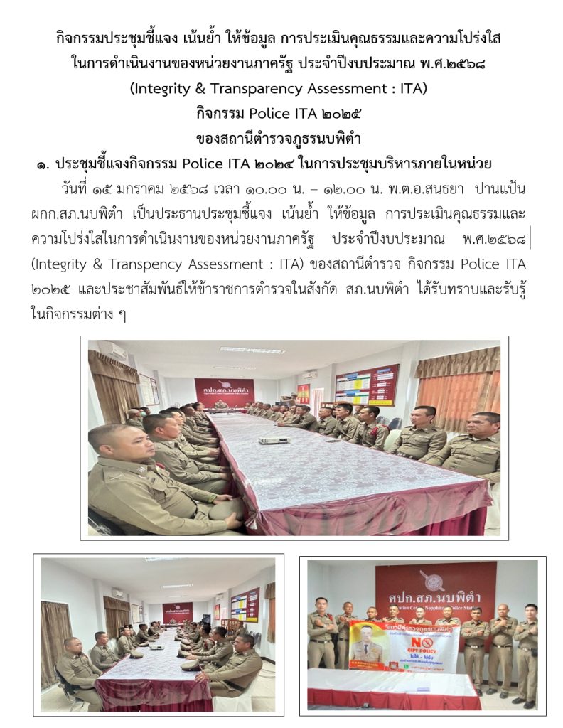 กิจกรรมที่ 4 กิจกรรมประชุมชี้แจง เน้นย้ำ ให้ข้อมูล การประเมินคุณธรรมและความโปร่งใส ในการดำเนินงานของหน่วยงานภาครัฐ ประจำปีงบประมาณ พ.ศ.2568 (Integrity & Transparency Assessment : ITA)